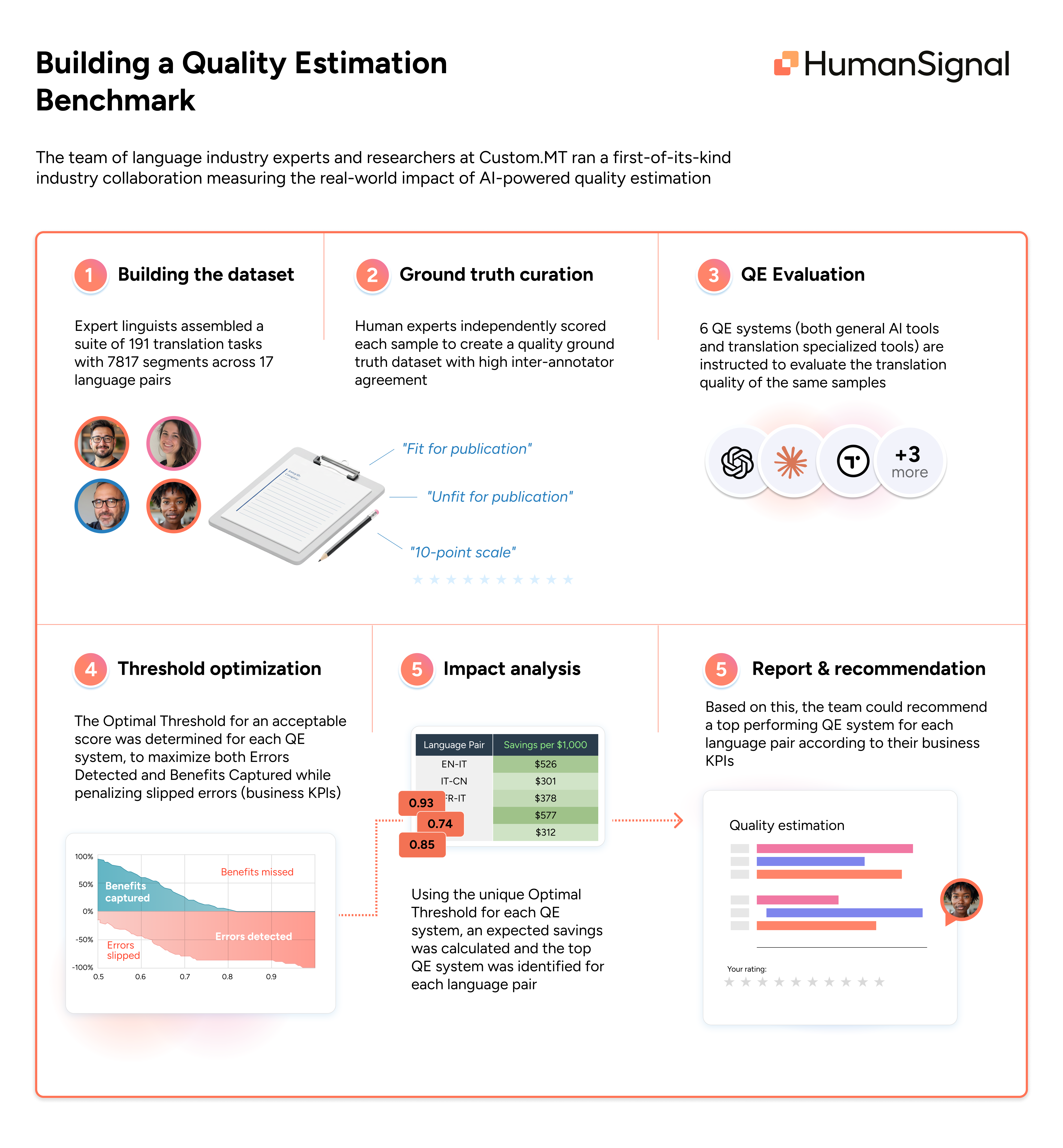 With this challenge in sight, the team of language industry experts and researchers at Custom.MT ran a first-of-its-kind industry collaboration measuring the real-world impact of AI-powered quality estimation. Equipped with Label Studio Enterprise, they were able to scale this benchmark to include: