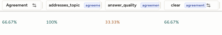 This is an especially helpful view of agreement to have. Now, we can see that all three LLMs agree on whether the post addresses the topic, two agree if the answer is clear, and none agree on the answer quality. Not only does this give us insight into how trusting we can be in our LLMs, it also tells us that there’s something fundamentally wrong with how we’re asking the LLMs to evaluate quality. This makes sense, because the quality question uses a 5 star rating scale, which LLMs are notoriously bad at. By having no consensus at all, we can establish that we need to fix our prompt or the question itself.