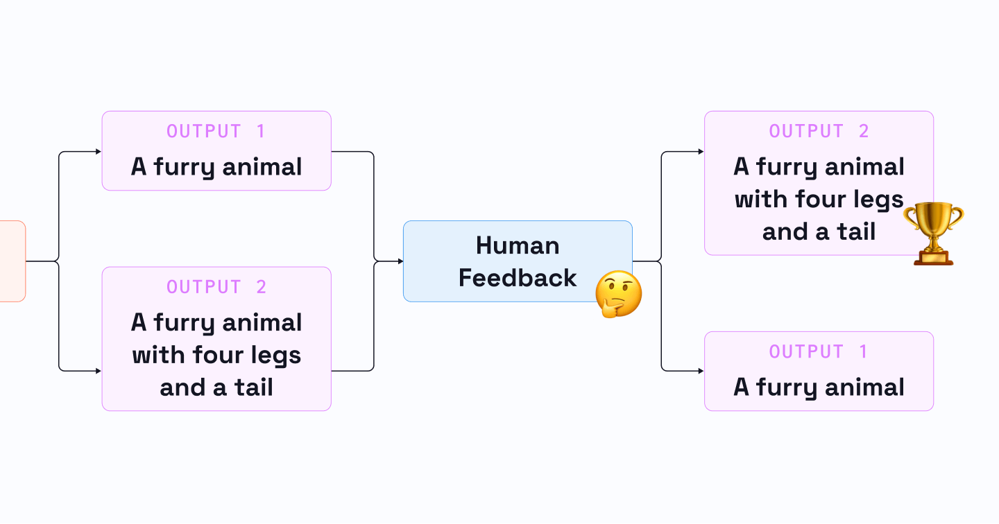 In order to tune our LLM, we will simulate human feedback with a reward model. The reward model takes in any text and assigns it a score of how well humans perceive it. In order to train this model, we need to collect a prompt-generation pairs dataset from our LLM. Next, we’ll have human annotators rank the generated text outputs from the initial language model. These rankings are used during the training process to teach the reward model how good humans think prompt-generation results are, while also having the labeling process be as simple as “which result is better.”