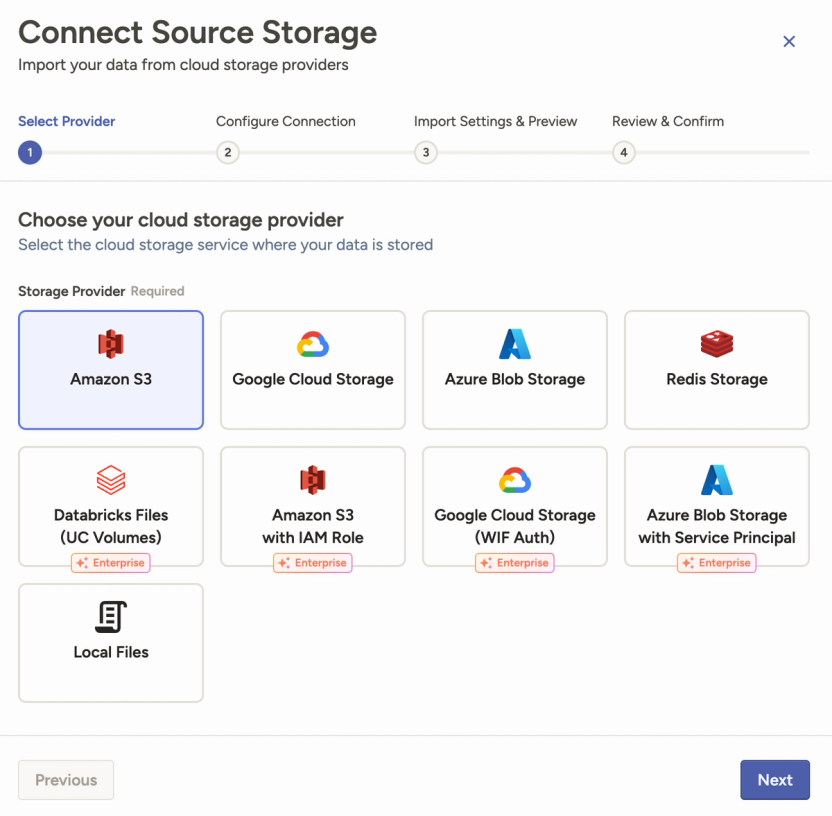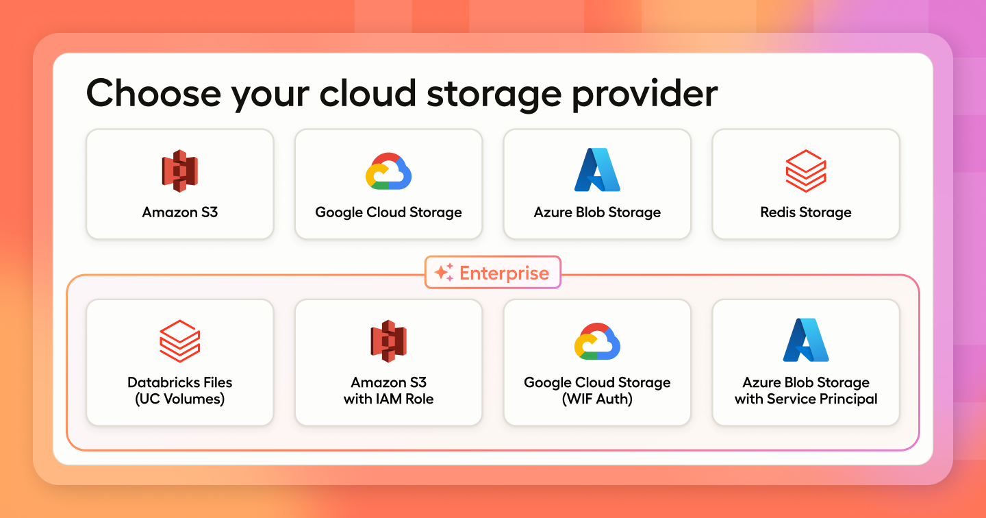 For a complete breakdown of supported storage systems and authentication methods, see the Enterprise storage connector documentation.
