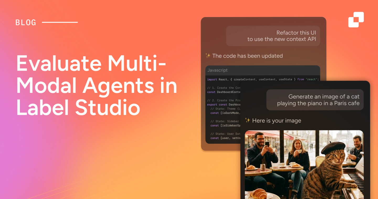 Label Studio now supports evaluating multi-modal agents across text, visuals, and application outputs. The goal is to give your team a simple place to review how an agent behaves, decide whether a new version is actually better, and capture structured feedback that feeds back into model improvement.
