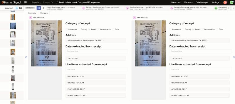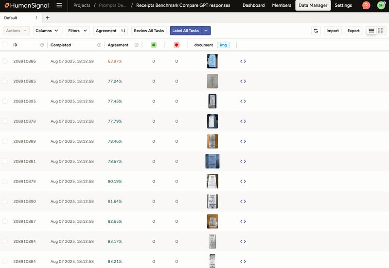 Equipped with our benchmark containing high-quality labeled data, we then generated outputs from GPT-5 models to compare with our ground truth. We could have sent each receipt image to the LLMs then captured and compared their responses, but preferred a more systematic and scalable approach.In this case, we used Label Studio Prompts to integrate LLMs into the evaluation workflow. With Prompts, connected GPT-5 (you can also connect other LLMs, including custom ones), bulk evaluated model responses against our ground truth labels, and tracked model performance across different versions. Since all LLM responses got populated into the Label Studio annotation interface, we were also able to review, annotate, and compare responses side by side.