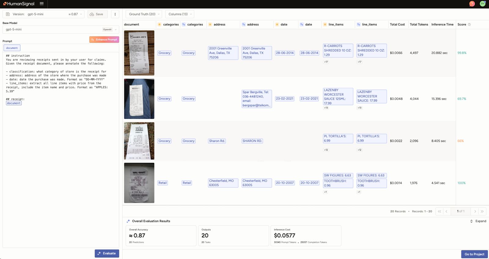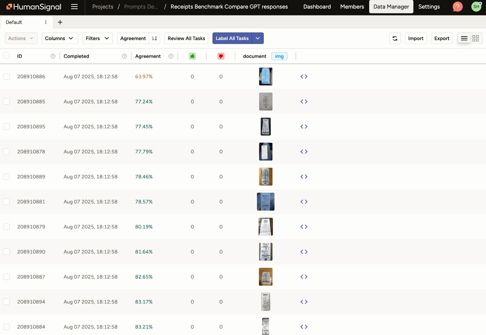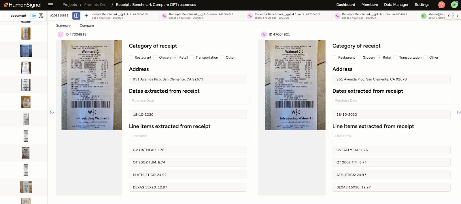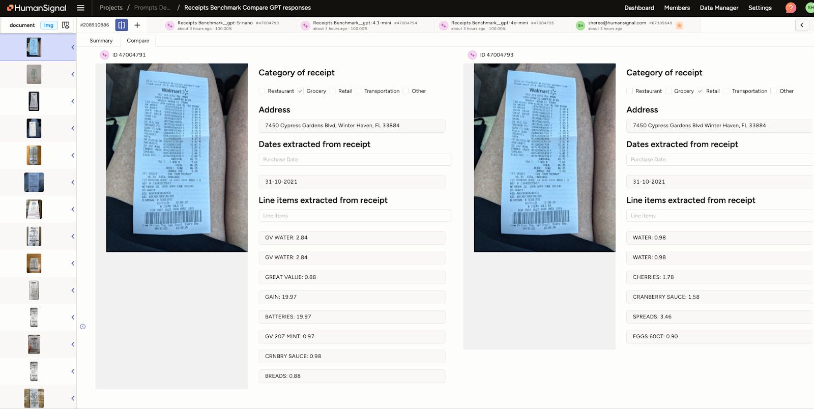Equipped with our benchmark containing high-quality labeled data, we then generated outputs from GPT-5 models to compare with our ground truth. We could have sent each receipt image to the LLMs then captured and compared their responses, but preferred a more systematic and scalable approach.In this case, we used Label Studio Prompts to integrate LLMs into the evaluation workflow. With Prompts, connected GPT-5 (you can also connect other LLMs, including custom ones), bulk evaluated model responses against our ground truth labels, and tracked model performance across different versions. Since all LLM responses got populated into the Label Studio annotation interface, we were also able to review, annotate, and compare responses side by side.
