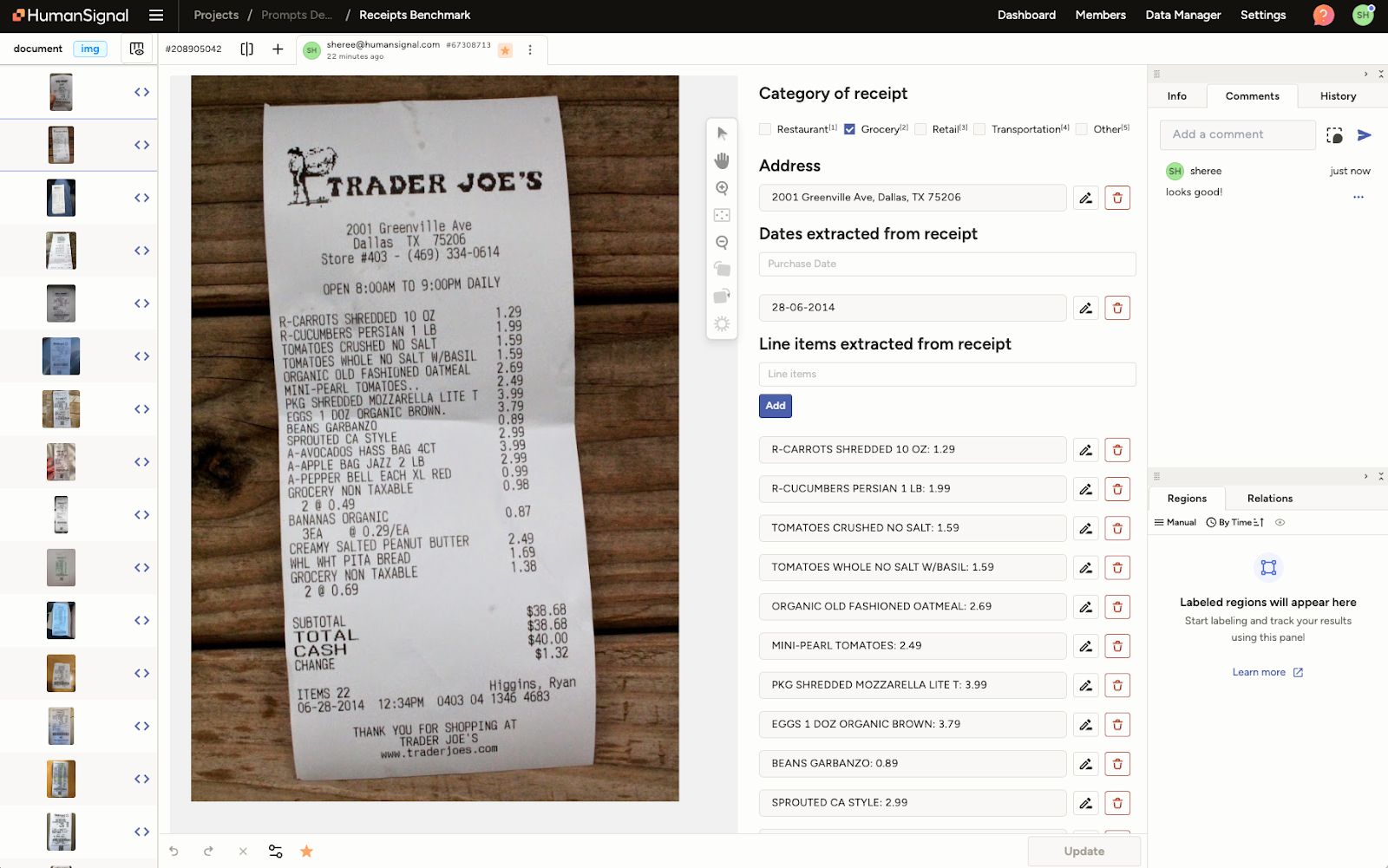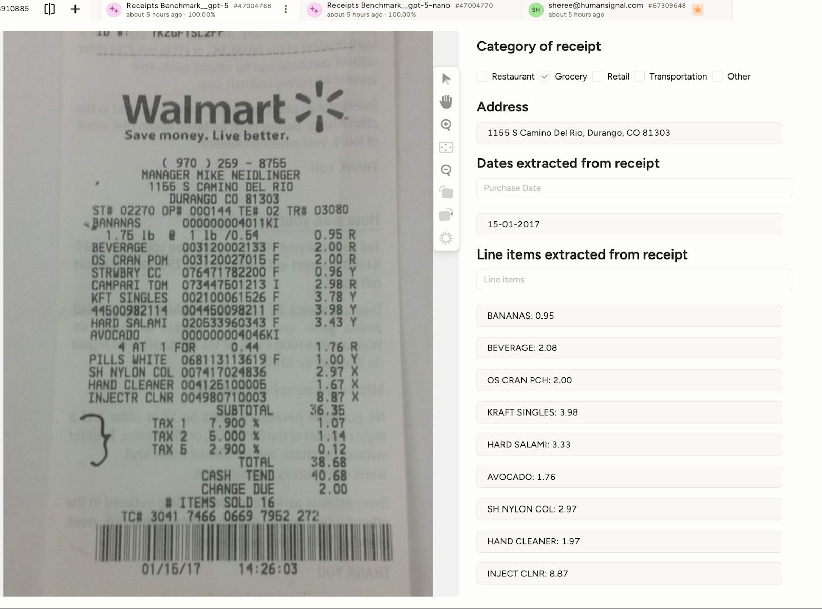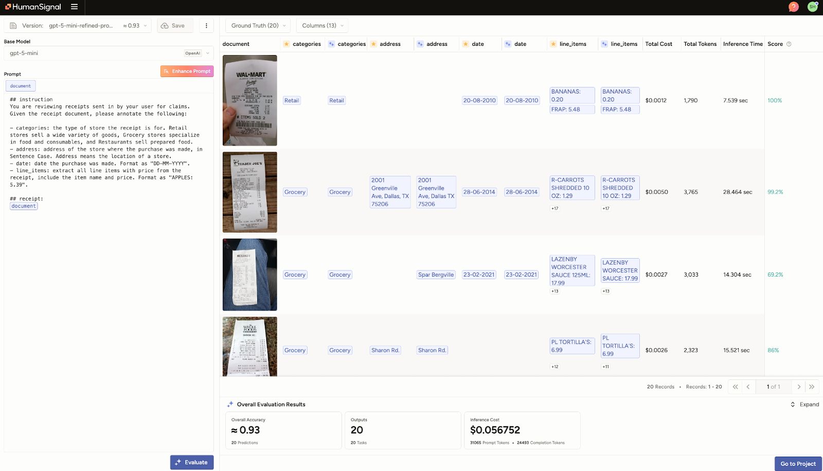 Equipped with our benchmark containing high-quality labeled data, we then generated outputs from GPT-5 models to compare with our ground truth. We could have sent each receipt image to the LLMs then captured and compared their responses, but preferred a more systematic and scalable approach.In this case, we used Label Studio Prompts to integrate LLMs into the evaluation workflow. With Prompts, connected GPT-5 (you can also connect other LLMs, including custom ones), bulk evaluated model responses against our ground truth labels, and tracked model performance across different versions. Since all LLM responses got populated into the Label Studio annotation interface, we were also able to review, annotate, and compare responses side by side.