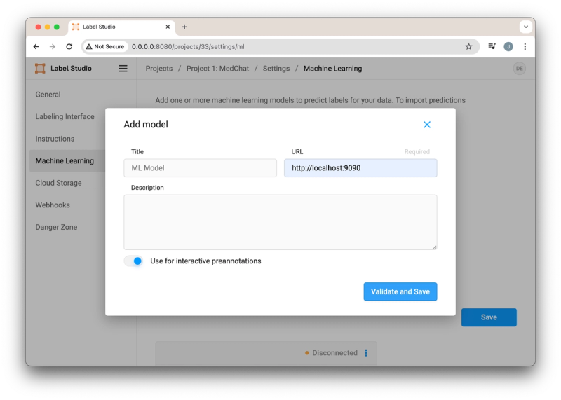 To connect the ML Backend to our project, navigate to our settings, enter the address of our Docker Compose deployment, and enable “Use for interactive predictions.”