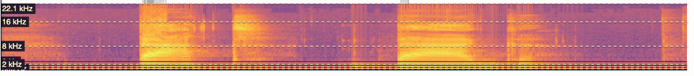Unlike a waveform, a spectrogram shows frequency over time. It’s computed mathematically by taking windows of the waveform and doing a fourier transform on it to decompose the soundwave into its component parts. Spectrograms show us the frequency patterns in the sound over time, using color to convey the loudness information that we get from the waveform.