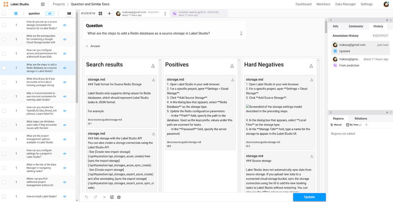 Check and Fix Pre-labeling: Look over the tasks in the Data Manager, checking how positives and hard negatives are distributed across buckets. Fix the errors and update annotations.