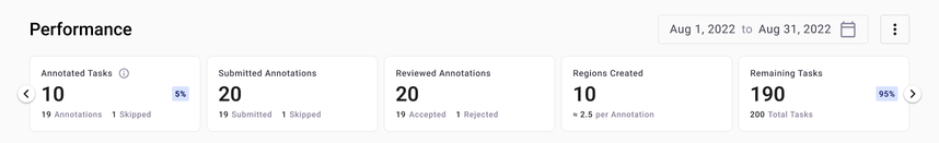 With our adjustable KPI cards, you can decide which metrics you want to have front and center. Whether it's the average time taken to label a task or the number of remaining tasks in the project, our KPI carousel provides an easy way to track progress and trends over time.