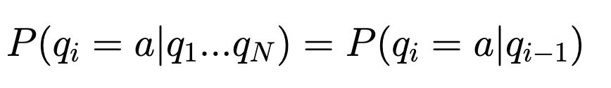 At its core, a Markov Model is a system that moves from one state to another over time. The key assumption, called the Markov assumption , is that the next state depends only on the current state, not on the sequence of previous ones. We can formalize this mathematically by saying that the probability of a state qi being equal to a given a set of N states is the same as the probability of a state qi being equal to a given just state qi-1 the previous state.