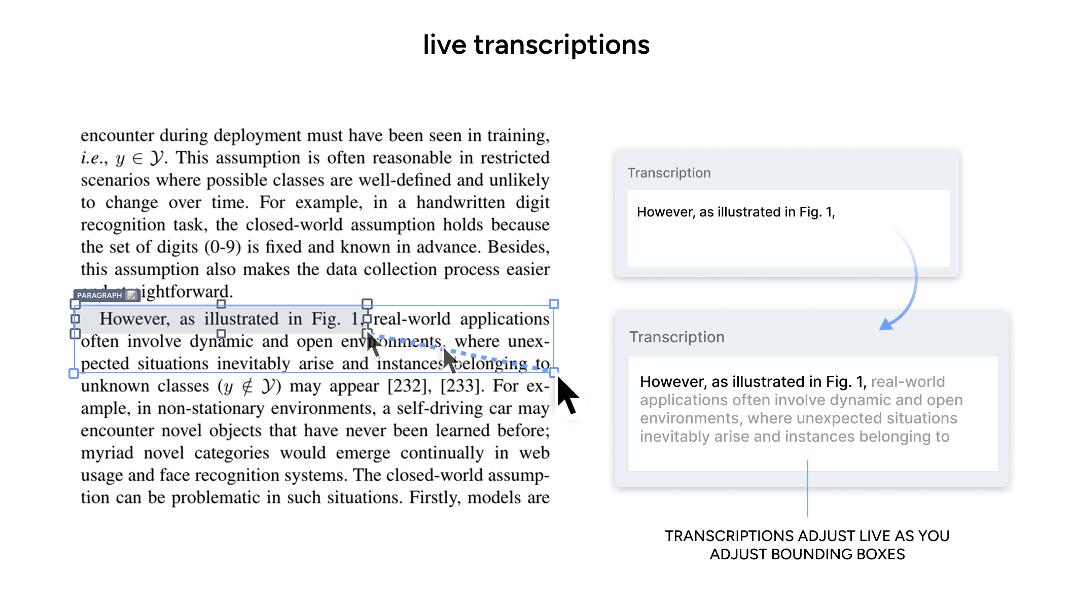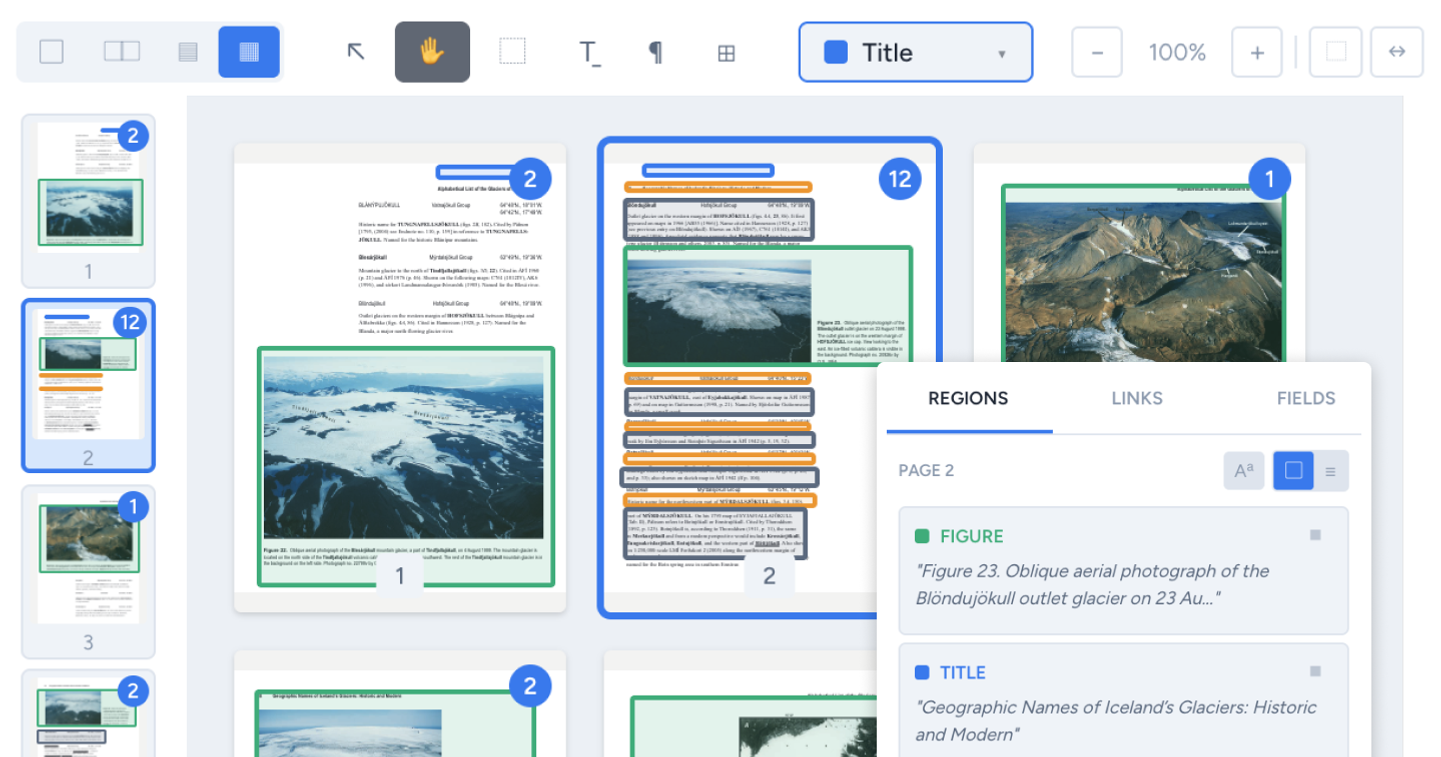 In addition to drawing regions, annotators can pick from 3 selector modes that intelligently capture individual words, sentences, or whole paragraphs with a single click. And we made it possible to automatically extract and populate common document metadata such as title, author, and date.