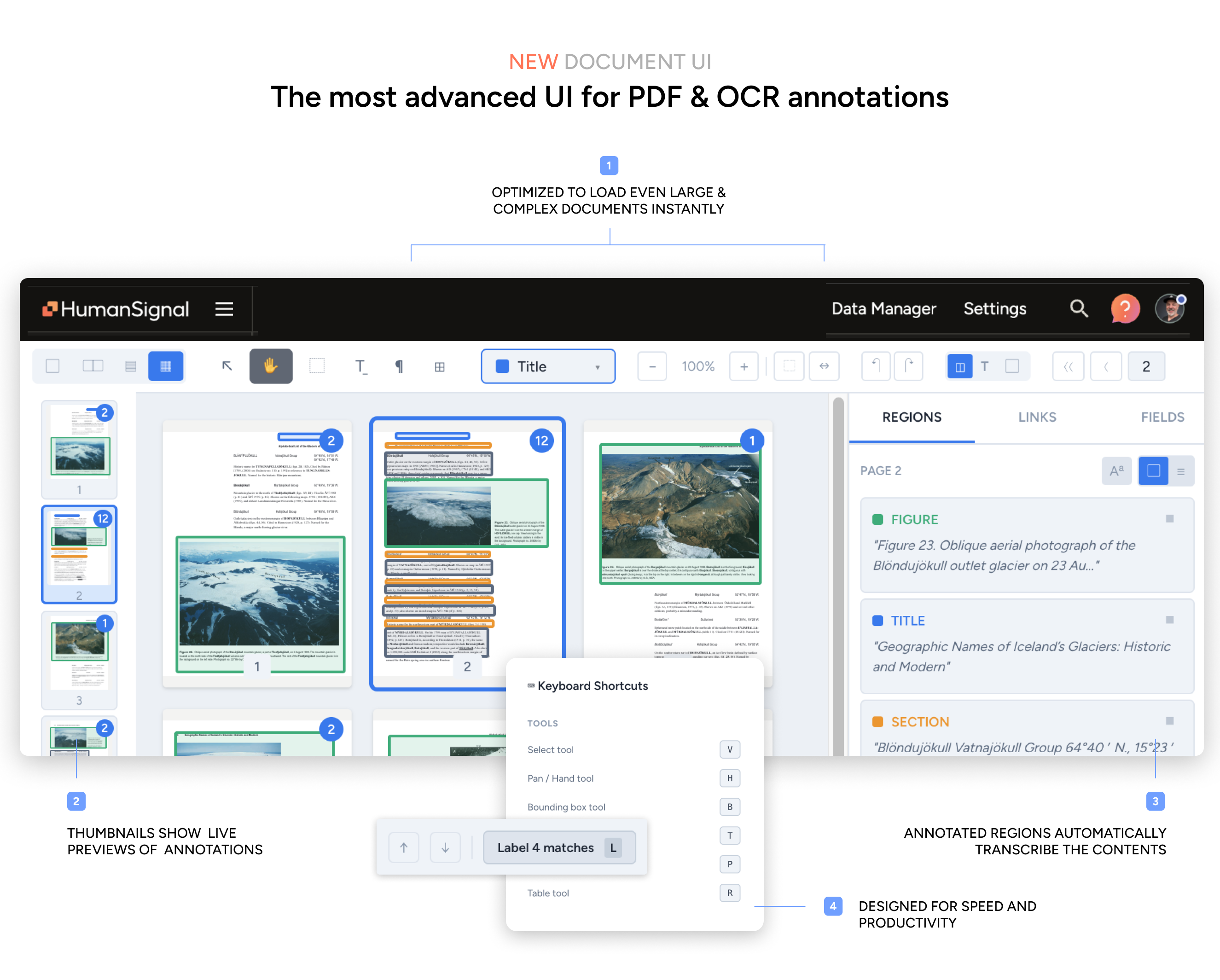 Because our users tend to spend lots of time with documents, we ensured full support for a keyboard-first workflow, with dedicated shortcuts for all the tools, navigation, labeling, search, zoom, rotation, and view modes.