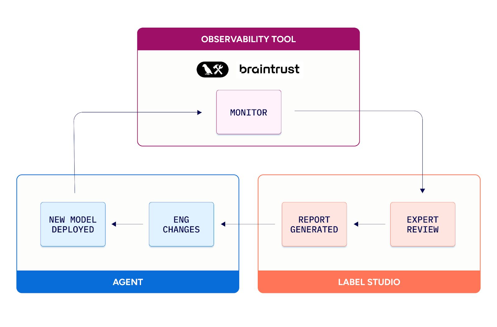 Engineers measure how the system behaves. Experts judge what the behavior means and whether it is desired and correct. Together, via the report and artifacts, they close the feedback loop to improve model performance. The structured labels can also flow back into observability dashboards and regression checks to track impact over time.