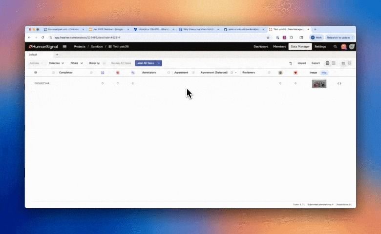 Once your YOLO backend is connected and your labeling config matches the classes you want to capture, YOLO26 becomes a practical way to speed up annotation: you start from model predictions, then reviewers correct and finalize labels.
