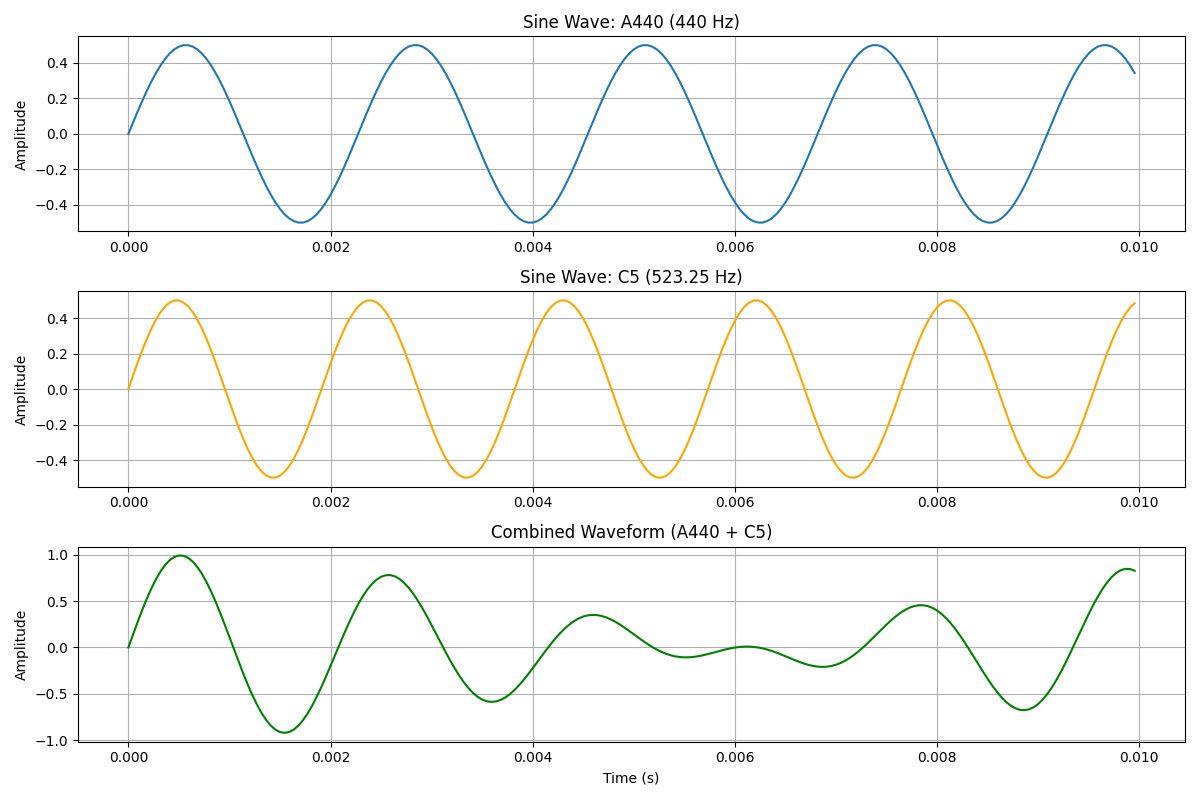 Let’s say you play the A440 tone (a sine wave at 440 Hz) at the same time as a C5 note (523.25 Hz). The resulting waveform isn’t two separate lines, it’s a sum of both waveforms. Sometimes the peaks line up and reinforce each other. Other times, they cancel each other out.