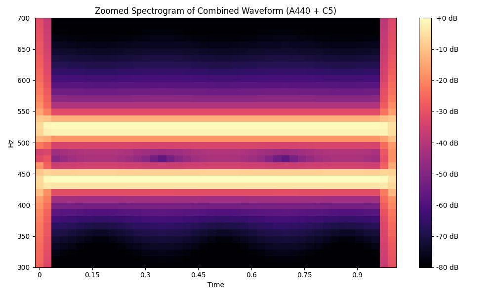 Let’s go back to the A440 + C5 example. The raw waveform showed a complex mix. But once we generate a spectrogram, we clearly see two distinct frequency bands, one at 440 Hz and one at 523 Hz. That’s the power of this tool: it reveals structure hidden inside the sound.
