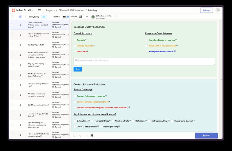 Using tools like Label Studio, we can present this context in a structured UI and ask reviewers to provide feedback on specific dimensions: