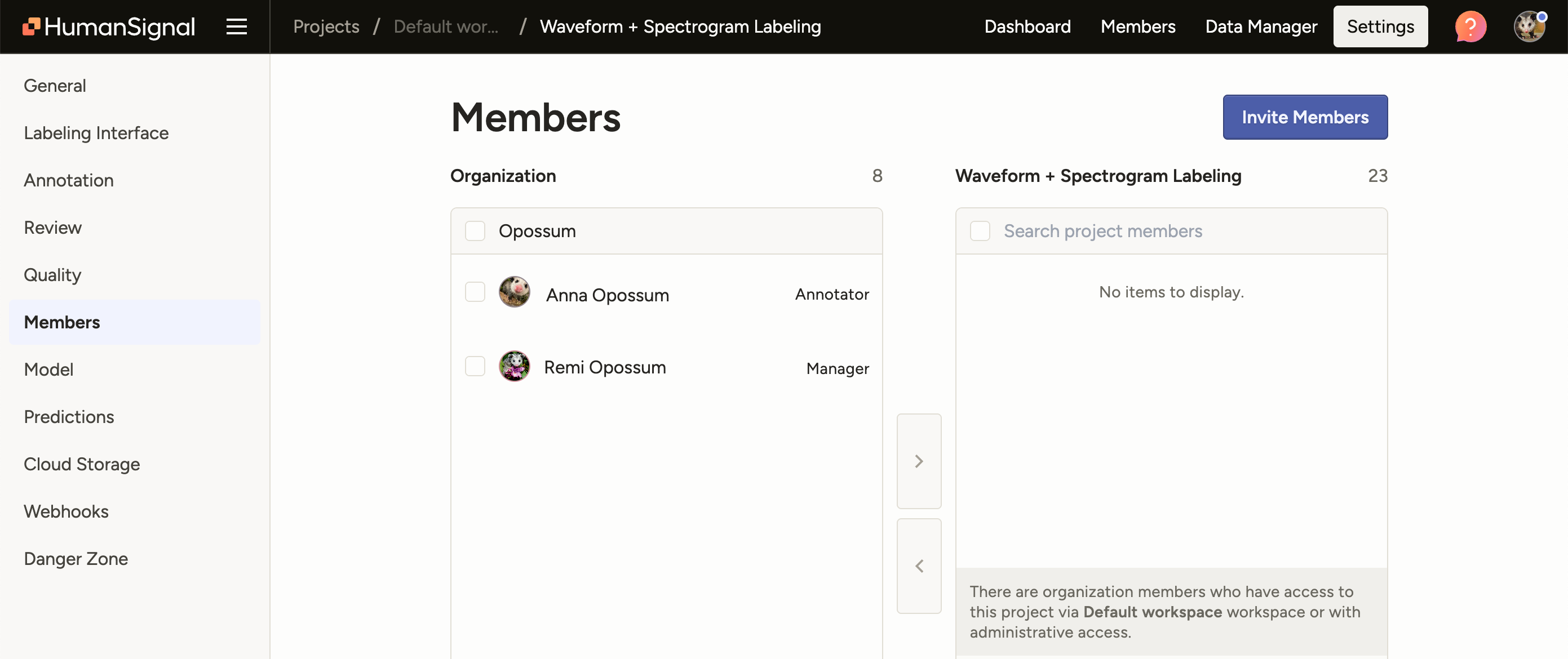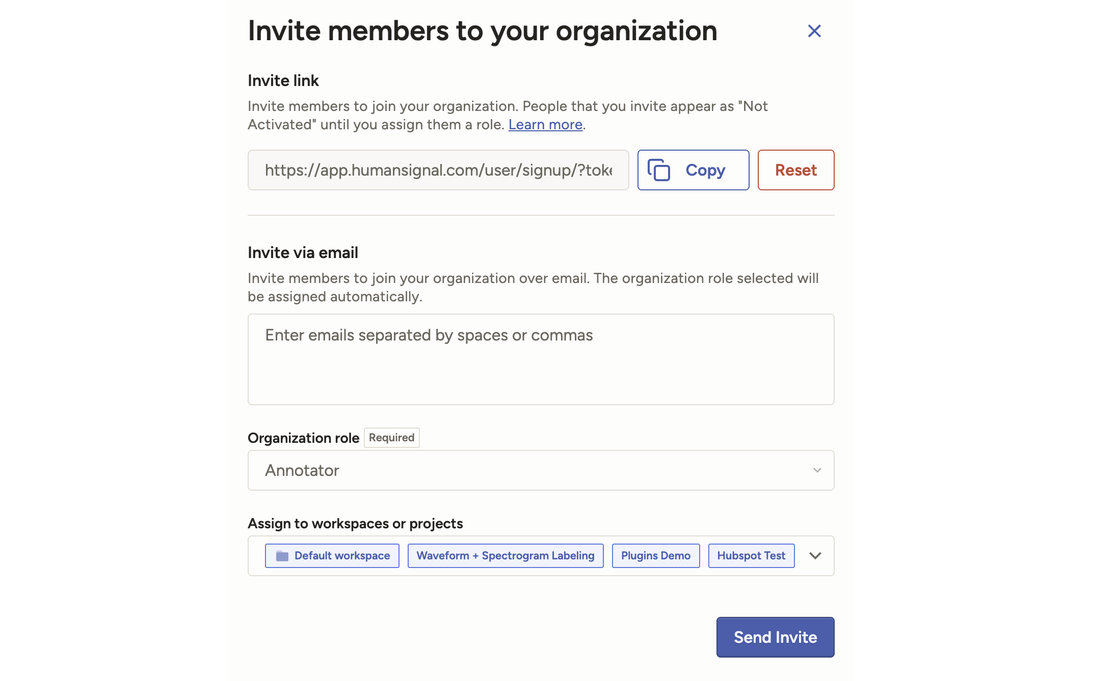 You can now select specific workspaces and projects when inviting new Label Studio users. Those users will automatically be added as members to the selected projects and/or workspaces: