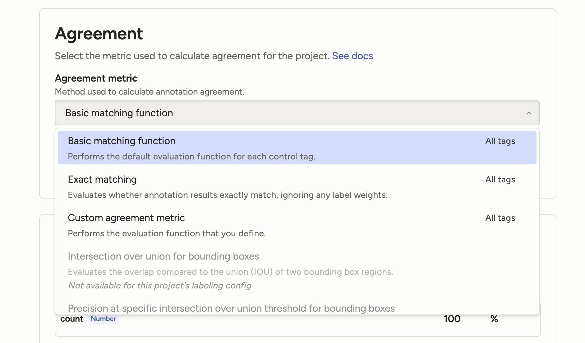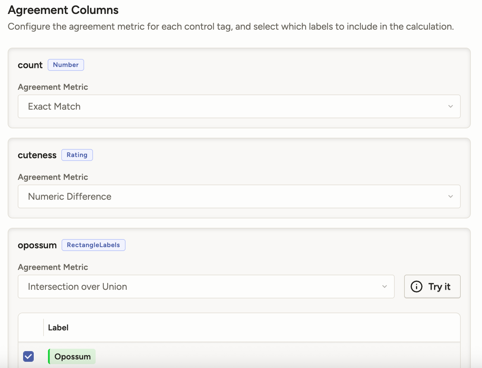 Previously, if you had multiple control tags in your labeling interface, you were limited to either the Exact Match metric or the Basic Matching metric, which would apply the default metric to each control tag.