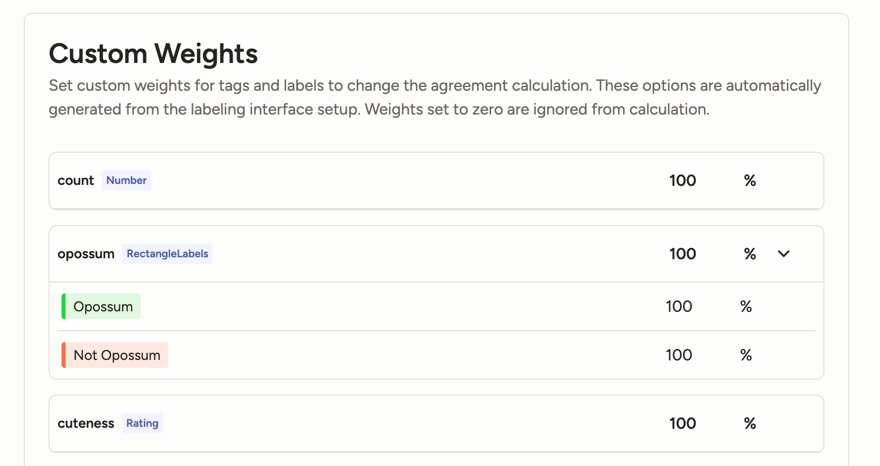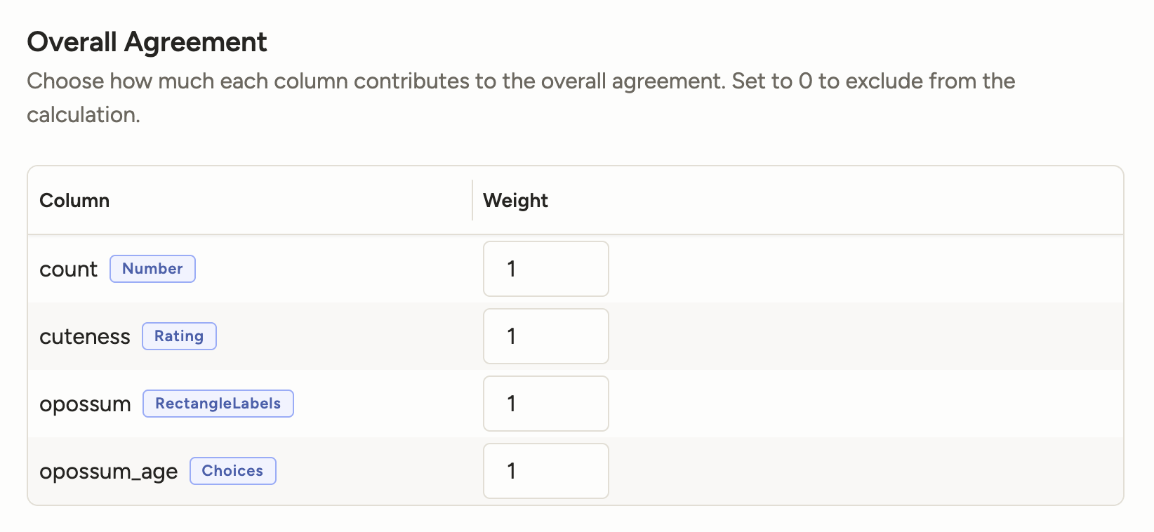<Labels>, <RectangleLabels>, <PolygonLabels>, etc.)<Choices><Pairwise><Rating><Taxonomy>Instead of being able to set a percentage-based weight for each individual class, you will soon only be able to include or exclude them from calculation by turning them on or off.