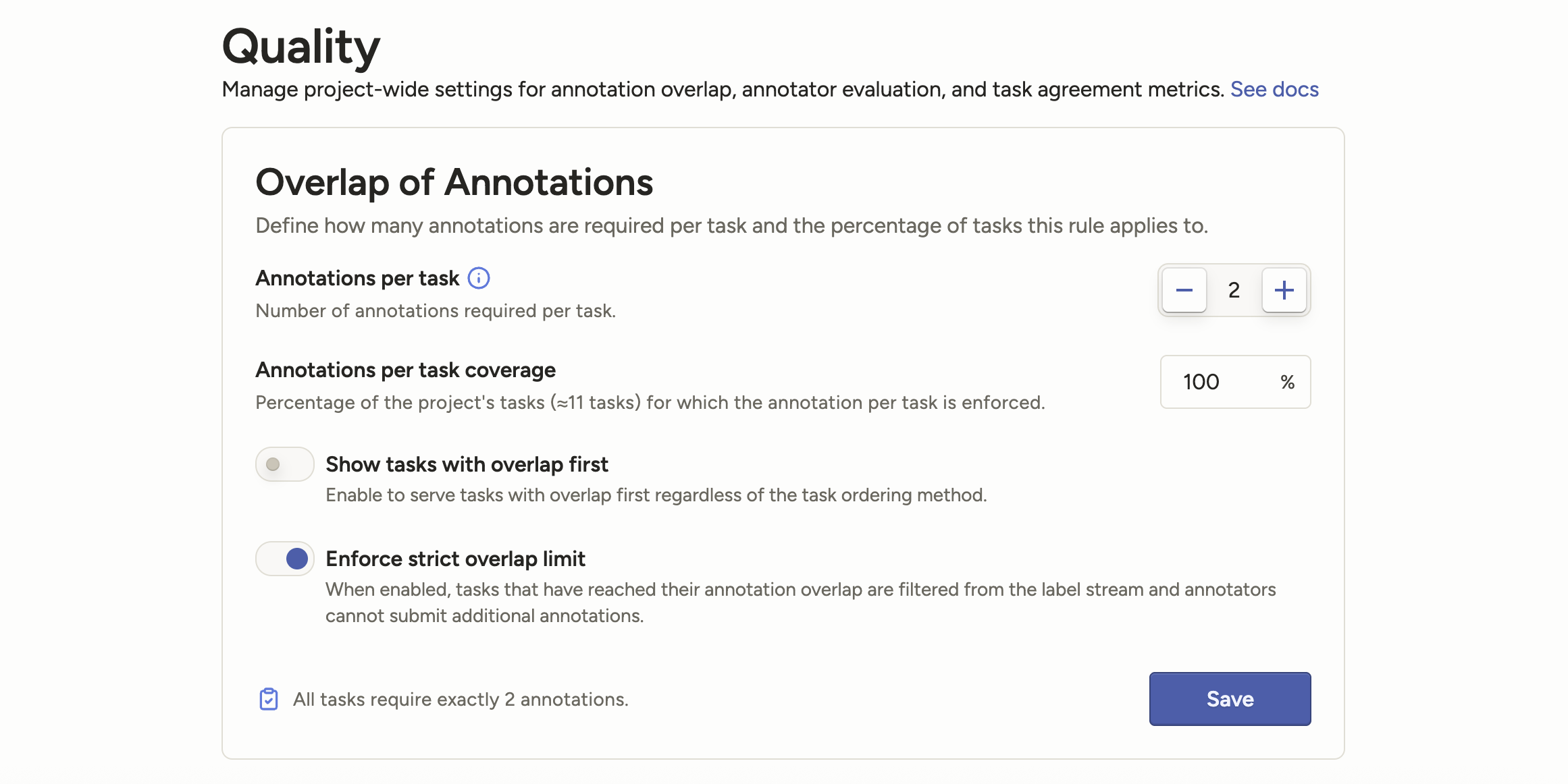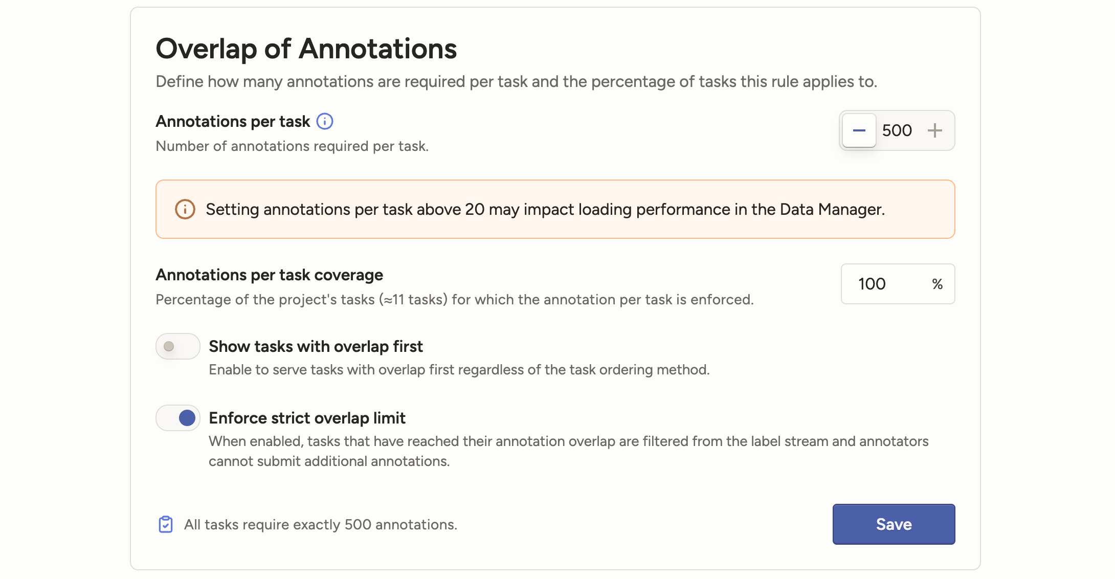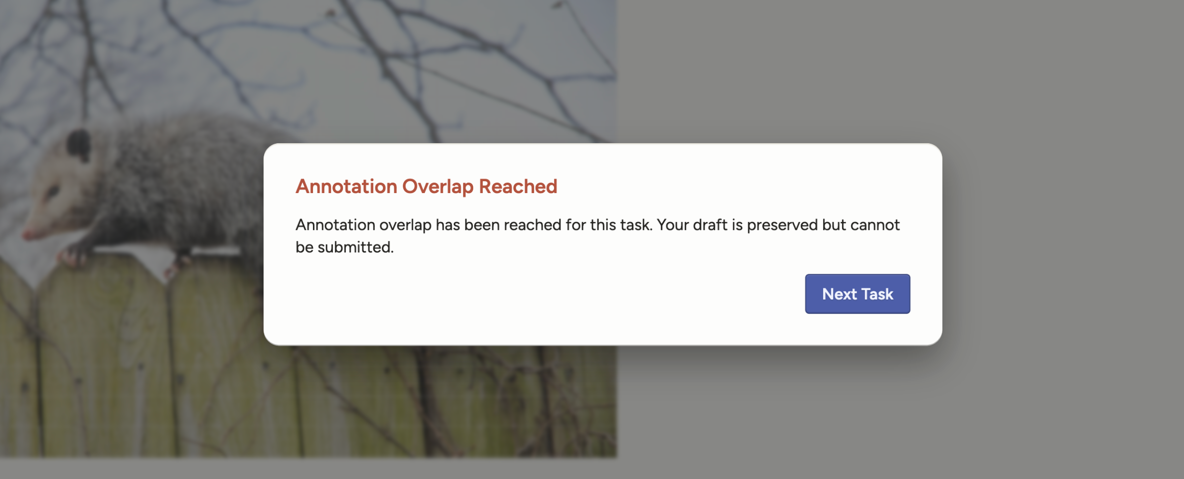 When this new setting is enabled, if too many annotators are try to submit a task, they will see an error message. Their draft will be saved, but they will be unable to submit their annotation.