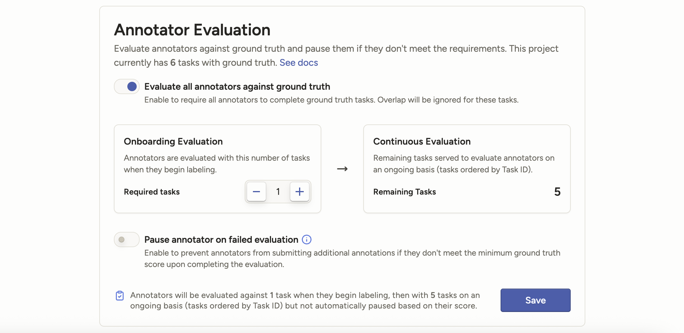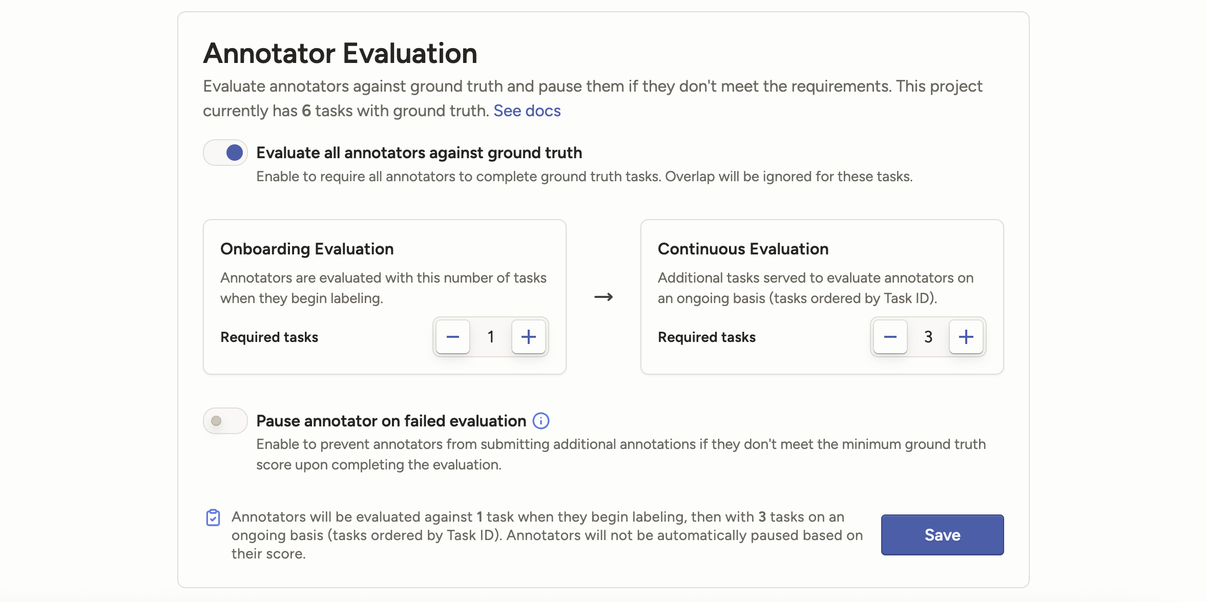 Previously, when configuring annotator evaluation against ground truth tasks, you could configure exactly how many ground truth tasks each annotator should see as they begin annotating. The remaining ground truth tasks would be shown to each annotator depending on where they are and the task ordering method.