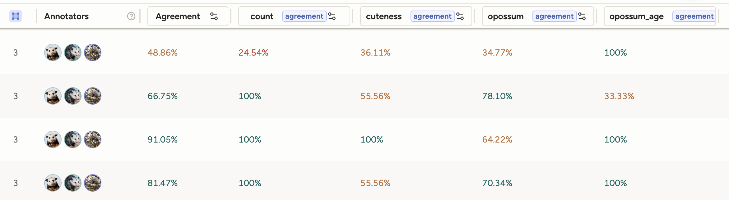 This is different than the Agreement column, which displays the average agreement score between all annotators.