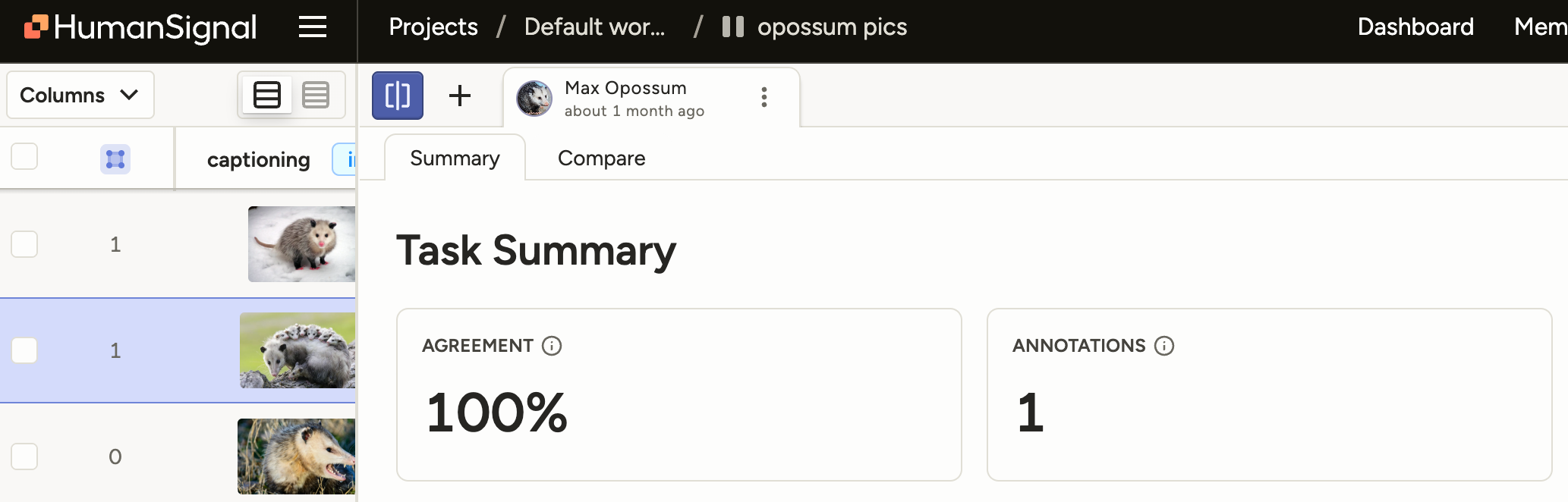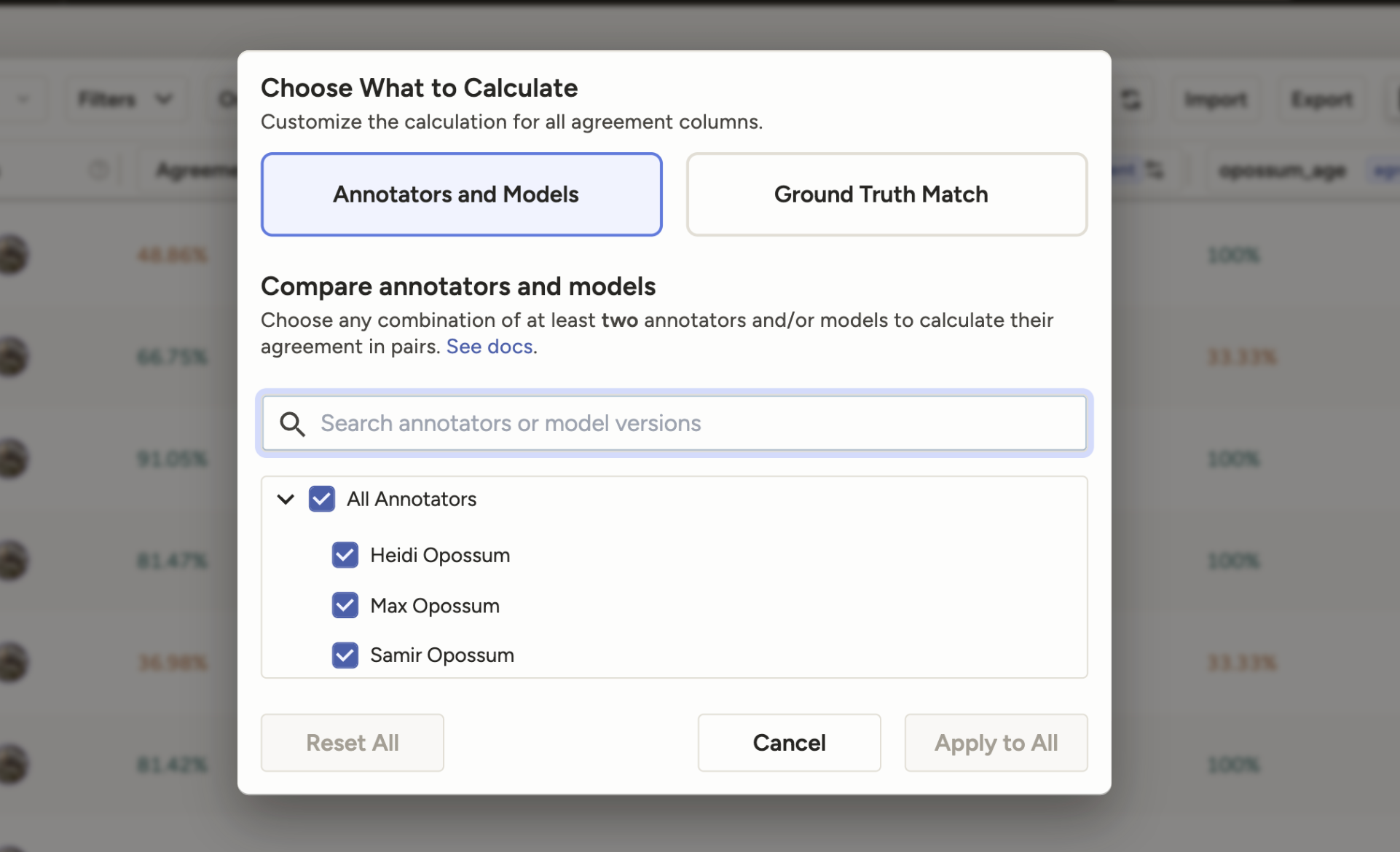There is a new Agreement (Selected) column that allows you to view agreement data between selected annotators, models, and ground truths.