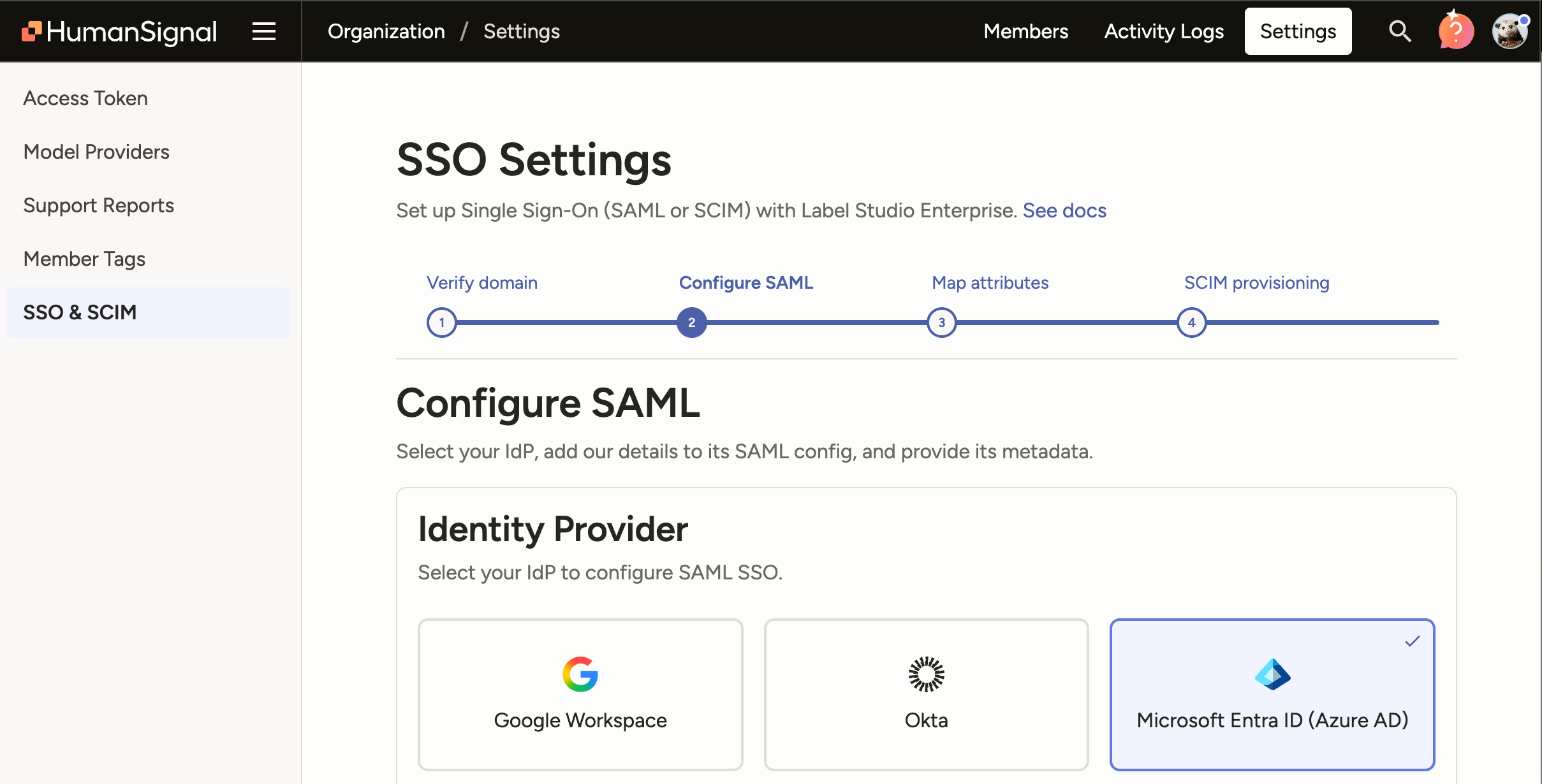 The SSO/SCIM settings are now located under Organization > Settings > SSO & SCIM.