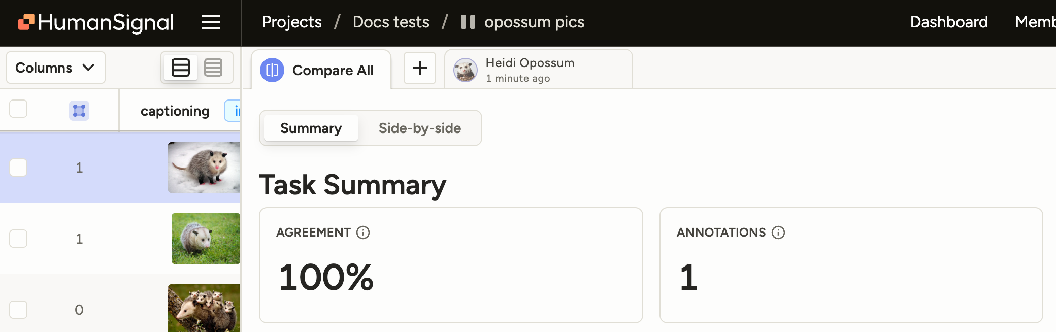 When you click the Agreement column in the Data Manager, you can see a pop-up with an inter-annotator agreement matrix. This pop-up will now also identify annotations with ground truths.