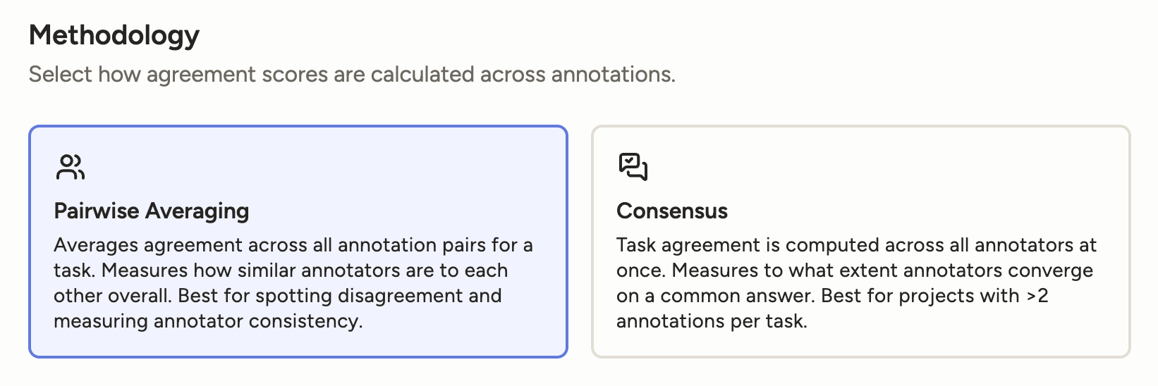 You can now select between Pairwise Averaging and Consensus methodology when calculating agreement.