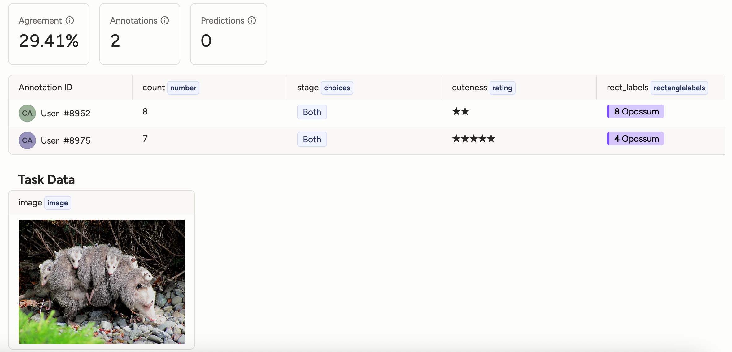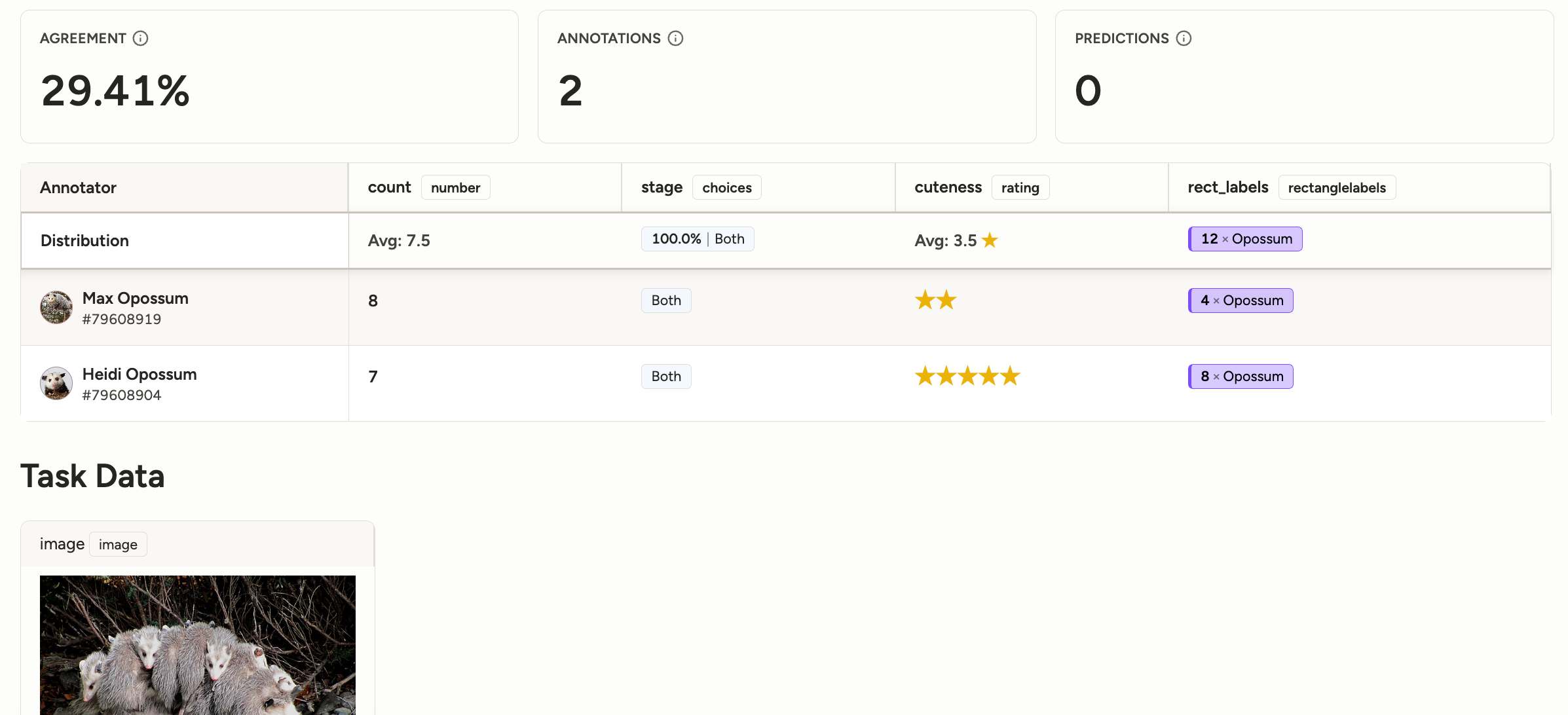 When using the View All action, users who are in the Reviewer role or higher can now see a summary of the annotations for a specific task. This summary includes metadata, agreements, and side-by-side comparisons of labels.