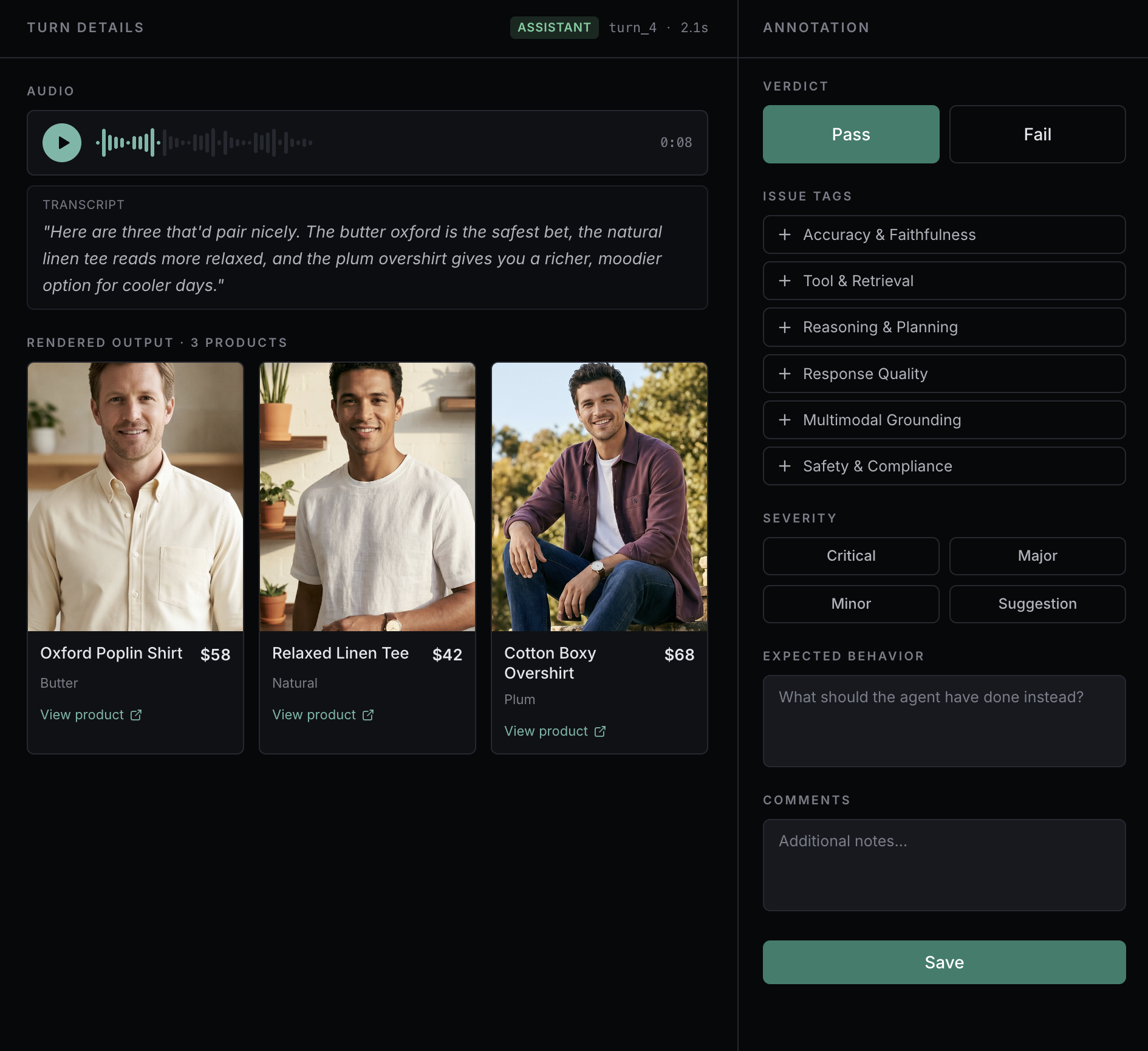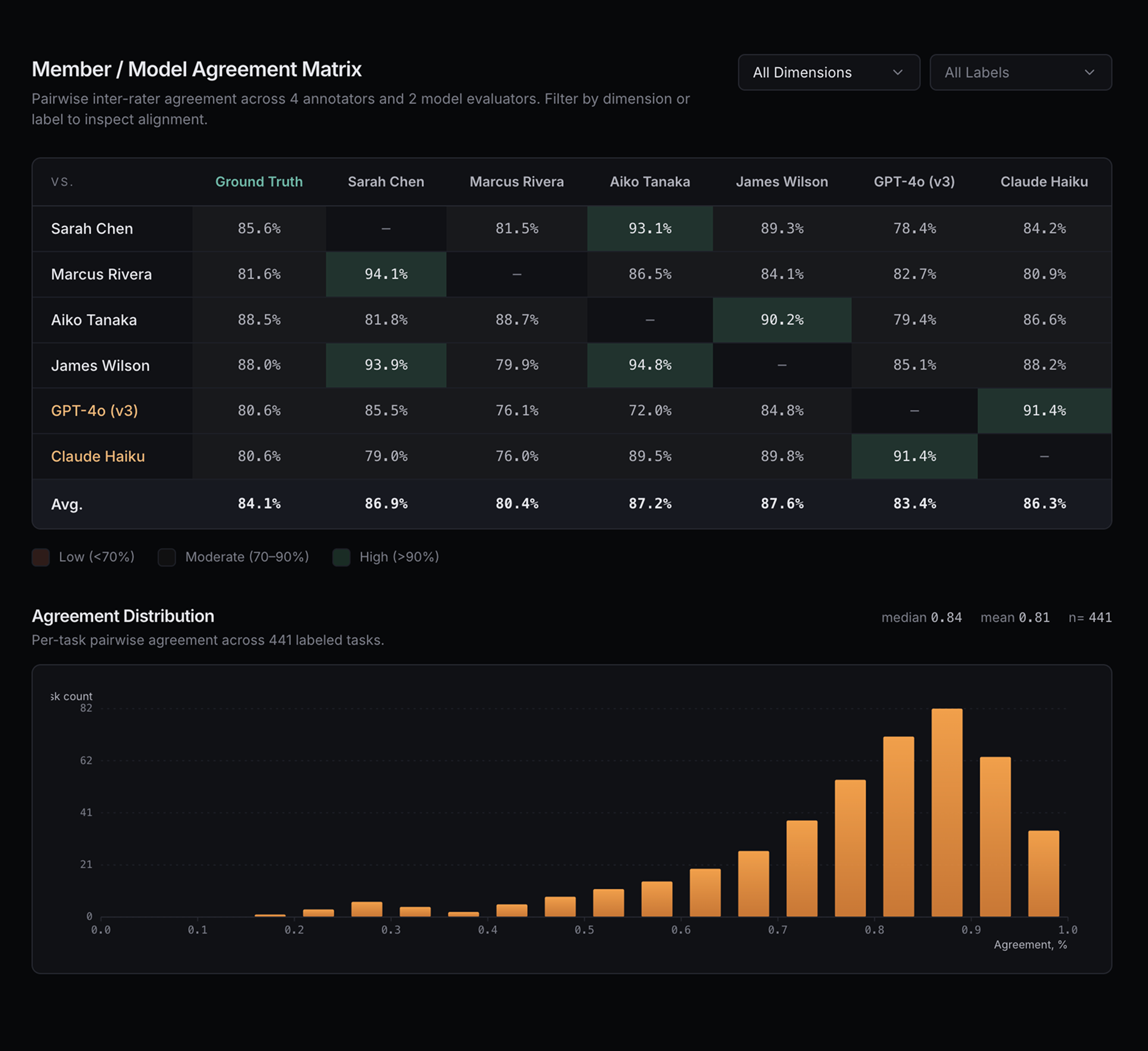 Score outputs across model versions, compare tradeoffs between frontier models, and predict real-world performance on the tasks your users actually care about.